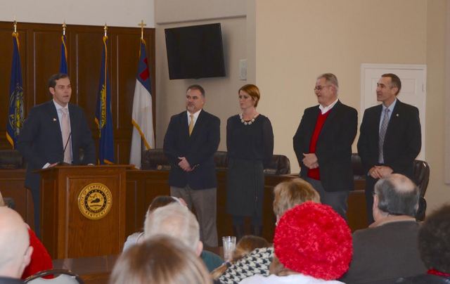 2015-01-03 - Campbellsville Civic Center, 205 N Columbia Avenue, Campbellsville, KY - Photo by Drew Tucker, Campbellsville Universtiy. State Senator Max Wise (KY-16) addressed a large group of enthusiastic supporters at the Cambpellsville Civic Center on Friday afternoon, after taking the oath of office. With him, from left, are State Representative Bam Carney, Senator Wise' wife, Dr. Heather Marie Hood Wise; State Senator Jimmy Higdon, of Lebanon, KY who represents neighboring Senate District KY 24 (Casey, part of Jefferson, Marion, Nelson and part of Spencer Counties); and State Senator David P. Givens, Greensburg, KY who represents the neighboring Senate District 9 (Allen, Barren, Green, Metcalfe, Monroe, and Simpson Counties). - CM. Paired Photo. See also: State Senator Max Wise takes oath of office