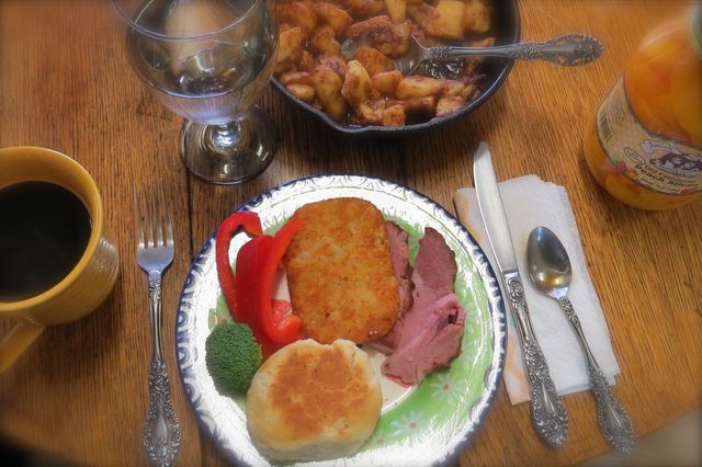 2014-12-25 - Photo Ed Waggener. Even the peasants eat well on Christmas: Christmas morning food included a bit of ham, biscuit, store-bought hash brown potato, red pepper, broccoli, hot black coffee and cinnamon apples in an iron skillet - and a new favorite any meal dessert: Amish canned peaches from South Fork or Black Gnat. - EW