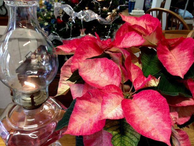 Christmas: Poinsettias and a coal oil lamp