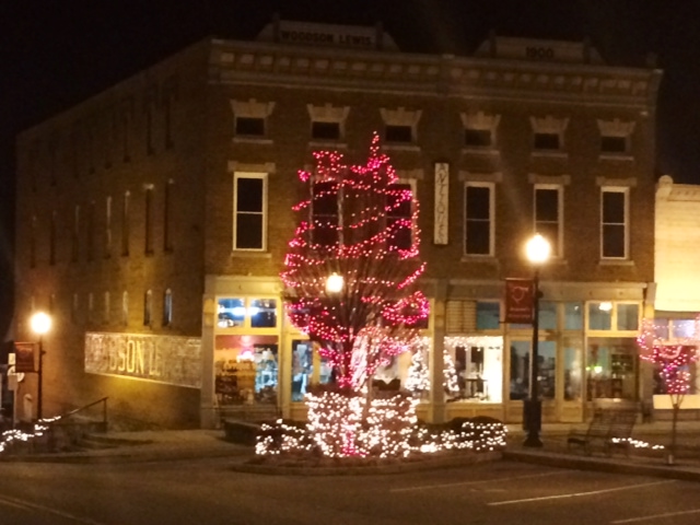 2014-12-25 - Downtown Greensburg, KY - Photo by Larry Smith. I feel honored to have been in the same graduating class as Ron Jones, whose genius guided the Christmas lighting for the City of Greensburg, KY this Christmas. This scene is on the south side of the square, in front of the Woodson Lewis Building. If you didn't get to see, I hope you do. I haven't seen prettier Christmas lighting this year. Larry Smith, Operations Manager, Shoreline Communications