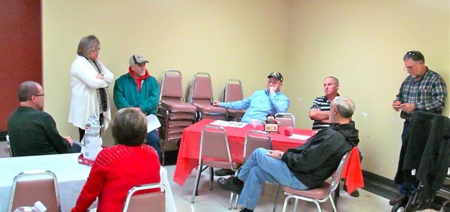 2014-12-22 - Adair Annex, 424 Public Square, Columbia, KY - Photo by Ed Waggener. The Adair Fiscal Court met in Emergency Session this morning, Monday, December 23, 2014, at 11amCT, approving a line item in the Clerk's Budget by a 6--0 margin. A payroll was for the office was moved to the outgoing clerk's budget. The incoming Clerk's budget will amended to show one fewer payroll in 2015. That action will take place in 2015. From left, clockwise, are Gale Cowan, recorder for the session; Magistrate Daryl Flatt (District 2), County Judge Executive Ann Melton, Magistrates Sam Baker (3), Perry Reeder (4), Harold Burton (1), Joe Rogers (6), standing; and Magistrate Billy Dean Coffey (5). Magistrate Billy Rowe (7), was not present. The court meeting was was covered by three representatives of the meeting. The informal meeting setting of the meeting was needed because of a Christmas Lunch which would start at noon today.