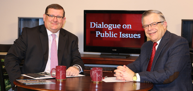Campbellsville University's Dr. John Chowning, vice president for church and external relations and executive assistant to the president of CU, right, interviews Hal Goode, president and chief executive office of the Kentucky Association for Economic Development, for his "Dialogue on Public Issues" show. The show will air Monday, January 5, 2015 at 1:30pmET and 6:30pmET and Wednesday, January 7, 2015 at 1:30 pmET and 7pmET on WLCU-TV, on Campbellsville's cable channel 10 and at 8 amET and at 6:30 pmET Sunday, January 4, 2015 on both WLCU-TV and on 88.7 The Tiger radio.