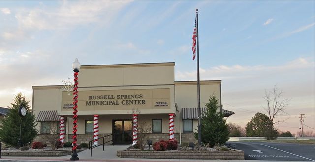 The Russell Springs Municipal Center, housing City Hall, the Police Department, and Water Commission, is Red, white and green for the holiday season. The handsome, functional building with easy access, is a model of municipal efficiency - it cost a fraction of what other cities have spent, and it was another case where a government unit did the right thing, adaptively re-using an existing building rather than build-on or build anew.