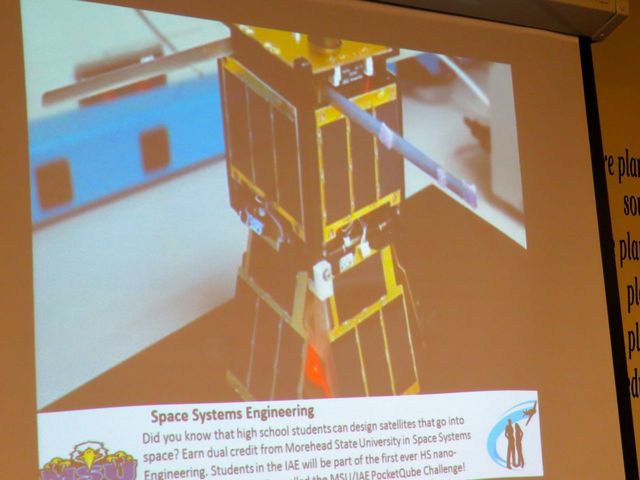 2014-12-20 - 1204 Greensburg Street, Columbia, KY - Photo from powerpoint by Dr. Tim Smith. Dr. Tim Smith used this photo to illustrate how far students in the new Air & Space Institute might be able to go - in high school. This PocketQube project, pictured above, is a made-in-Kentucky-satellite actually capable of launching into earth orbit. This one cost about $100,000, Dr. Smith said, and was built at Morehead State as an entry in PocketQue competition. He said that, with miniaturization, satellites can be built which will fit in the palm of one's hand. The PocketQue company sells satellite kits for around $20,000, we've found since the meeting. Putting that in perspective, that's one-fifth the cost of the average Adair County bridge, four time the cost of a single City/County 4th of July Fireworks project, or half the cost to local government for City of Columbia Diamond Reo concert, so maybe a satellite launch is something - if India can go to Mars, why can't we have our own earth satellite - the Adair County High School Air & Space Institute, maybe in cooperation with neighborhood aerospace programs at Metcalfe County, Taylor County and Monroe County High Schools to carry out next year and launch from a cape on Green River or Barren River Lakes. Probably, if Michael Campbell were still here, he would already have one built, at a cost of around $100, with parts from e-Bay. Comments? (Clicking Read More accesses the Thu 18 2014 Adair County School Board meeting account, with several photos on the Adair Air & Space Institute.)