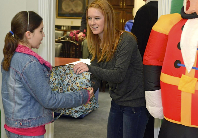 2014-12-20 - Roberta C. Cranmer Dining Center, 430 Helen Flatt Drive, Columbia, kY - Photo by Duane Bonifer, LWC. Gracie Matney, 9, of Greensburg, Ky., left, receives a backpack of gifts from Lindsey Wilson College graduate student Natalie Vickous of Columbia at the second-annual Community Christmas Dinner, held Friday night, December 19, 2014, at LWC's Roberta D. Cranmer Dining & Conference Center.