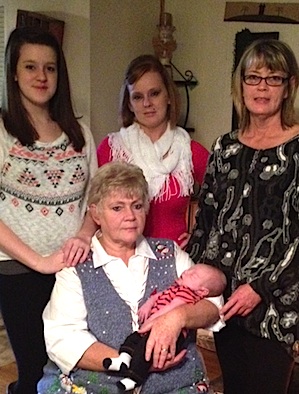 2014-12-20 - Columbia, KY - Photo by Justin Bailey. Five generations at 2014 Caldwell Christmas gathering. Sandra Caldwell Kerns, Melissa Caldwell Meadors, Amanda Caldwell Bailey, Cheyenne Caldwell Lewis, and Treyton Caldwell McClister. - Justin Bailey