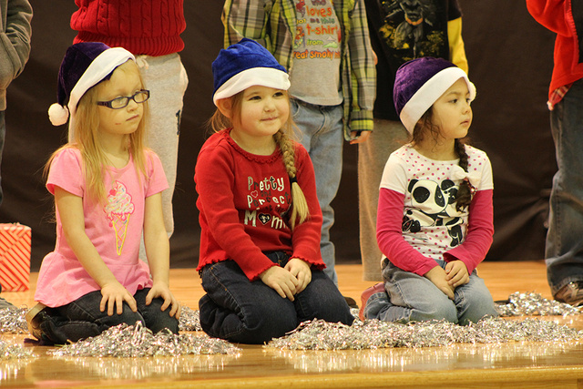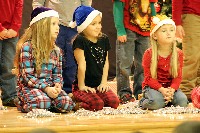 2014-12-19 - 158 Col. Casey Drive, Columbia, KY - Photo by Shamarie Claiborne, Adair Co. School District. Kaitlynn George, Lydia St. Andrew, Mailee Lopez wait for their cue from Mrs. Marcum to start their performance yesterday at ACPC's Kindergarten Program entitled Christmas Showstoppers. - Shamarie Claiborne