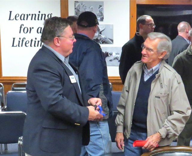 2014-12-19 - 1204 Greensburg Street, Columbia, KY - Photo by Ed Waggener. No one was more excited than Buddy Sewell, right, about the Aerospace Pathway. Sewell spoke with IAE founder Dr. Tim Sewell after the meeting. Sewell had been recognized in the audience by Supt. Reed, who quipped the Cane Valley had been around since about the time of the Wright Bros. Reed also recalled that Sewell had served eight years on the Adair County School Board.