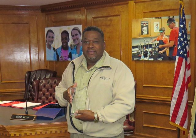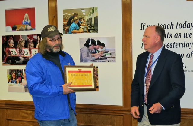 2014-12-19 - 1204 Greensburg Street, Columbia, KY - Photo by Ed Waggener. Gerald Jones, left, who oversaw building of the Technology Career Center and the installation of bus canopies for Adair County High School and Adair County Elementary School, received special recognition from Adair County School District Buildings and Grounds Superintendent David Jones. David Jones said that only rarely do paths cross where one meets a man as extraordinary as Gerald Jones. "We did not get one complaint during the projects," David Jones said. "He did the canopies in sections to minimize interference with regular school traffic. He poured concrete at night and on weekends. And not one time did he ever complain." David Jones added, "I hope he's in charge of the new bus garage." The bus garage project moved forward last night, Thu 18 Dec 2014, with the decision to hire the architectural firm of Sherman, Carter & Barnhart, Architects, of Lexington, KY for the project. David Jones said he's hopeful the project will be complete by opening day for the 2015-2016 school year. -EW