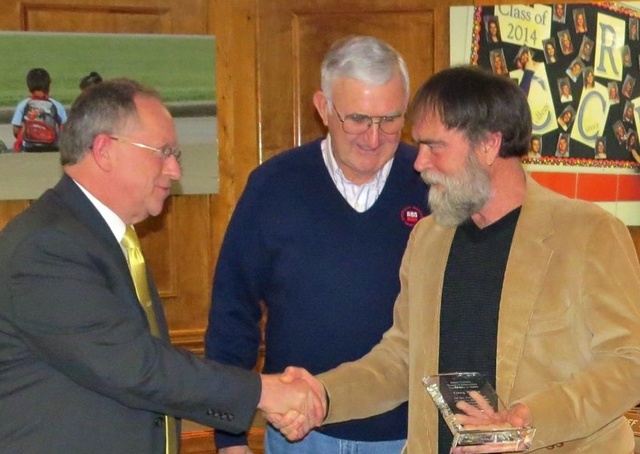 2014-12-19 - 1204 Greensburg Street, Columbia, KY - Photo by Ed Waggener. Superintendent Alan Reed, left, presented a plaque recognizing the service of outgoing Division 1 Adair County Board of Education member Greg Willis, as Board Chairman Floyd Burton, center, looks on. Unless there is a special called meeting, the regular 3rd Thursday, 18 Dec 2014 meeting was Willis' last for his current term, 1 Jan 2013 through 31 Dec 2014. His successor, Terry Harvey, who was in the audience, will take office in January, 2015.