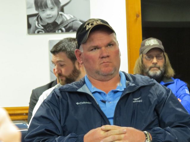 2014-12-19 - 1204 Greensburg Street, Columbia, KY - Photo by Ed Waggener. Chris Janes, Chairman of the Columbia-Adair County Airport Board, listened intently to the presentation of Dr. Tim Smith, who introduced the Aerospace pathway at the Adair County Board of Education meeting Thu 18 Dec 2014. The C/AC airport is planned to be training facility for the Aerospace program. Other members of the airport board are Howard Loy, Mike Mitchum, Bill Troutwein, and John Rarey. Behind Chairman Janes are, left, Coach Travis Gay, and right, Alliance Corporation's Gerald Jones. - EW