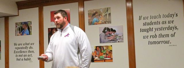 2014-12-19 - 1204 Greensburg Street, Columbia, KY - Photo by Ed Waggener. Dr. Tim Smith, a native of Pine Knott, Kentucky, and founder of Kentucky-born Institute for Aerospace Education, presented plans for establishing a new Career Path and College preparatory pathway in Aerospace Education at Adair County High School. The Adair County Board approved the recommendation unanimously. The local program will be bolstered by Aerospace programs already in place at Taylor County High School, Metcalfe County High School, and Monroe County High School. Networking is important in the program, Dr. Smith said. Student involved become more than classmates, he said. They start as classmates and then seem to be more like brothers & sisters, he said. - EW. Photo Thu 18 Dec, 2014, meeting of the Adair County Board of Education.