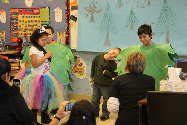 2014-12-18 - ACPC, 158 Col. Casey Drive, Columbia, KY - Photo by Shamarie Claiborne, Adair Co. School District. Cast members of "The Little Pine Tree" performed by Jennifer Perkins room on Wednesday, December 17, 2014, included Big Pine: Antonio Owens; Little Pine: Austin Huff; First and Second Tree: Aiden Pelston; Wind: Alyssa Frausto; Goat: Josiah Thurman,; Tree Fairy: Yuri Aguirre; and Greeter: Will Shepherd. Shown here are Aiden Pelston, Austin Huff, Antonio Owens, and Yuri Aguirre when the tree fairy gives "little pine" his pine needles back so he can be just what he is -- a little pine tree. - Shamarie Claiborne, Media Promotions Coordinator, Adair County School District