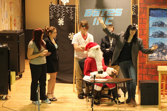 2014-12-17 - ACPC, 158 Col. Casey Drive, Columbia, KY - Photo by Shamarie Claiborne, Adair Co. School District. The villain owner of Bates INC receives a letter from a child saying their video game about Santa isn't nice and they don't like it and sets the stage for Santa's abduction. The scene includes Jessi Taylor, Gretchen Miles, Zane Sanders, Tristan Phelps, and Schyler VanArsdale. - Shamarie