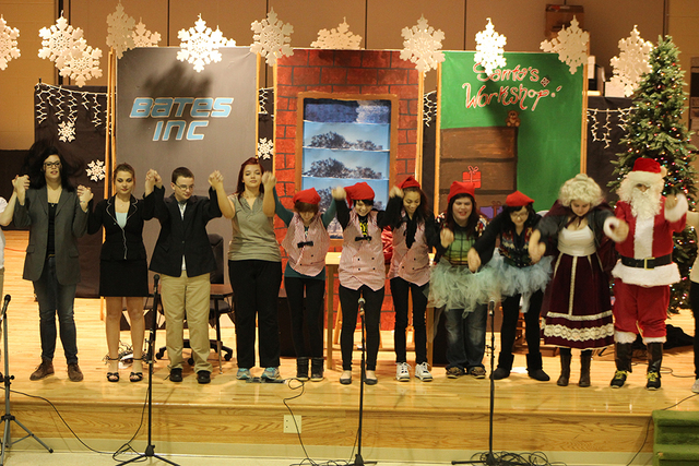 Bates employees lure Santa away for a quick trip to Hawaii for a few hours rest before his big trip around the world. Shown in the scene are Selena Foster, Brook Spaulding, Angaleea Smith, Jacob Schiling, Zane Sanders and Schyler VanArsdale. - Shamarie