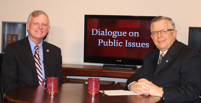 Campbellsville University's Dr. John Chowning, vice president for church and external relations and executive assistant to the president of CU, right, interviews Dr. Ronald W. Crawford, president, Baptist Theological Seminary in Richmond, Richmond, VA, for his "Dialogue on Public Issues" show. The show will air Monday, December 22 at 1:30pmET and 6:30pmET and Wednesday, December 24 at 1:30 pmET and 7pmET on WLCU-TV, on Campbellsville's cable channel 10 and at 8 amET and at 6:30 pmET Sunday, December 21 on both WLCU-TV and on 88.7 The Tiger radio.