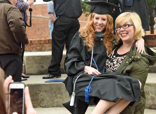 2014-12-14 - Lindsey Wilson College, Columbia, KY - Photo by Duane Bonifer, LWC. Lindsey Wilson College graduate Lauren Wright of Hendersonville, TN, celebrates earning her master's degree in counseling and human development Saturday morning, December 13, 2014 with her friend Morgan Lamberth of Hendersonville, TN, after the college's 100th commencement ceremony. - DUANE BONIFER