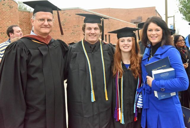 2014-12-14 - Lindsey Wilson College, Columbia, KY - Photo by Duane Bonifer, LWC. Lindsey Wilson College Assistant Professor of Theatre Robert Brock, left, and his wife, Tammy, join theatre arts graduates Sam Wilson of Bowling Green, KY, and Lacy Martin of Tompkinsville, KY, Saturday afternoon in the LWC Campus Quadrangle following the college's 10th commencement ceremony in Biggers Sports Center. - DUANE BONIFER, LWC