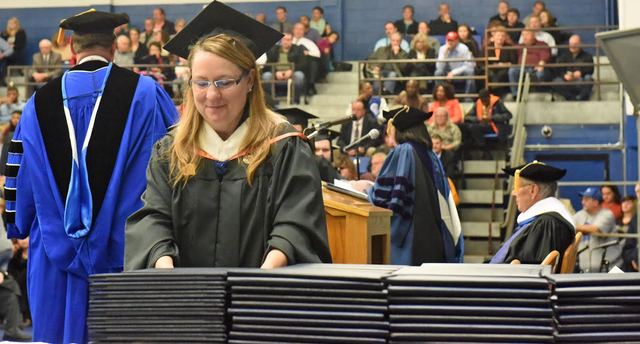 2014-12-14 - Biggers Sports Center, 360 Spikard Drive, Columbia, KY - Photo by Duane Bonifer, LWC. Lindsey Wilson College Associate Dean of the School of Professional Counseling Jackie Montgomery collects diploma cases for President William T. Luckey Jr. to present Saturday morning during college’s 100th commencement ceremony in Biggers Sports Center. - DUANE BONIFER