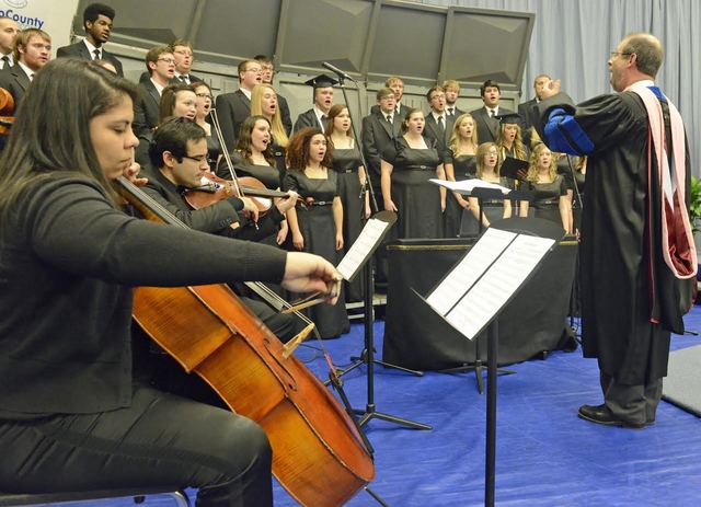 Lindsey Wilson College Associate Professor of Music and Director of Choral Activities Gerald Chafin directs the Lindsey Wilson Singers Saturday morning, December 13, 2014, during the college's 100th commencement ceremony in Biggers Sports Center. - DUANE BONIFER, LWC