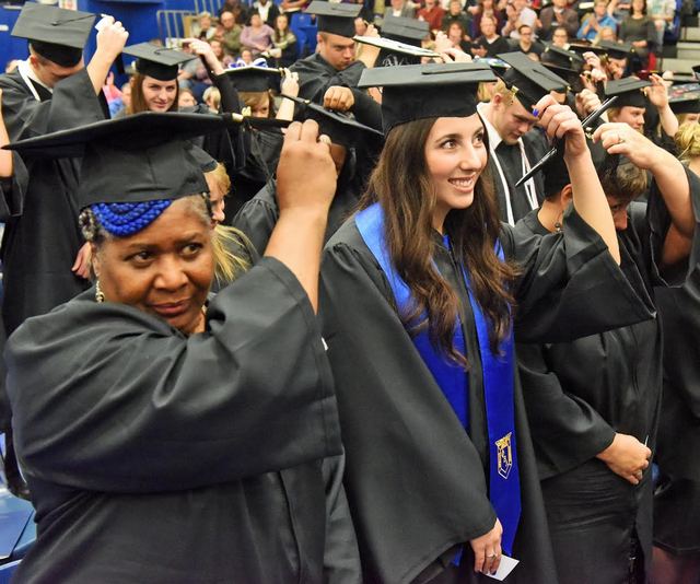 Baccalaureate graduates Ellen Veronica Sloane of Louisville, KY, left, and Natalie Slinker of Greensburg, KY, move the tassels of their mortar boards from right to left to symbolically represent their graduation from Lindsey Wilson, Saturday morning, December 13, 2014, during the college's 100th commencement ceremony in Biggers Sports Center. - DUANE BONIFER, LWC