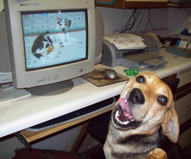 Smiley at the computer. And the funny thing is that Kelsey is on the screen saver. You can see how he got the name "Smiley". - PEG SCHAEFFER