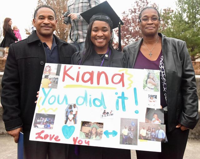 Lindsey Wilson College graduate Kiana D. Butler of Gallatin, TN, center, displays a poster her parents, Thomas and Patricia, made to celebrate her graduation Saturday morning from Lindsey Wilson College. Butler earned a bachelor of arts degree in human services and counseling. - DUANE BONIFER, LWC.