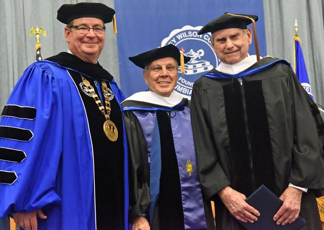 2014-12-13 - Biggers Sports Center, 360 Spikard Drive, Columbia, KY - Photo by Duane Bonifer, LWC. Lindsey WIlson College President William T. Luckey Jr., left, joins 2014 winter commencement honorary doctorate recipients former Southeast Kentucky Community and Technical College President W. Burce Ayers, center, and longtime Lindsey Wilson trustee John Gorrell of Lexington, KY