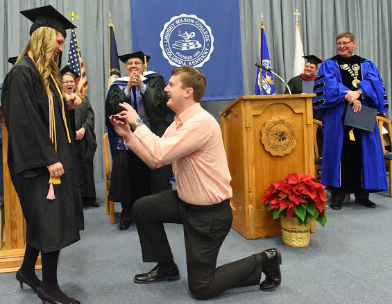 2014-12-13 - 360 Spickard Drive, Columbia, KY - Photo by Duane Bonifer, Lindsey Wilson College. Lindsey Wilson College 2014 alumnus Clinton Berry proposes to 2014 winter graduate Caitlyn Harrod of Springfield, KY, Saturday morning on the stage of Biggers Sports Center. Berry had just given the ceremony's benediction. Harrod - who earned a bachelor of arts degree in integrated music education, summa cum laude - accepted the proposal. - Duane Bonifer