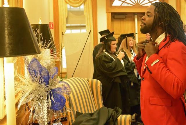 2014-12-13 - 210 Lindsey Wilson Street, Columbia, KY - Photo by Duane Bonifer, Lindsey Wilson College. Anthony Lamar Hubbard of Chicago, who earned a bachelor of arts degree in communication from Lindsey Wilson College, straightens his tie Saturday morning in the L.R. McDonald Administration Building lobby. - Duane Bonifer, LWC