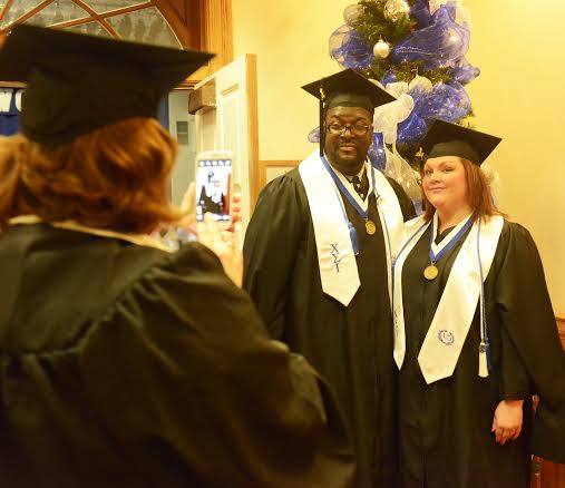 2014-12-13 - L.R. McDonald Administration Building, 210 Lindsey Wilson Street, Columbia, KY - Photo by Duane Bonifer, Lindsey Wilson College. Jessica Phelps of Edmonton, KY, takes a picture of Miran McClendon of Louisville, KY, and Alisha Poland of Scottsville, KY, Saturday morning in front of a Christmas tree in the L.R. McDonald Administration Building. All three received a master of education degree in counseling and human development at Lindsey Wilson College’s 100th commencement ceremony, held in Biggers Sports Center. - Duane Bonifer, LWC