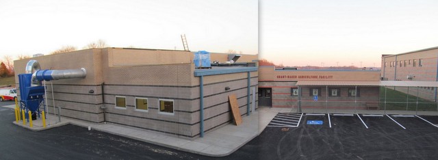 2014-12-11 - 526 Indian DR, Columbia, KY - Photo (c) ColumbiaMagazine.com. The spliced photo give an idea of how the Technology Center Building, left of splice line, and the existing Grant-Baker Agriculture Facility look as the Techology Center nears completion on 11 Dec 2014, with a newly paved parking lot and cleaning work underway in the newly constructed area.