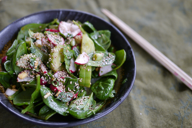 2014-12-11 - Photo by Pen. Classic kimchi is fermented, but some of the best kimchi is meant to be eaten almost immediately, like this mixture of radishes, cucumber and spinach, with green onion, fresh ginger, and cilantro. The dressing is rice wine vinegar, sugar, and salt, with a little paprika and cayenne for color and flavor.