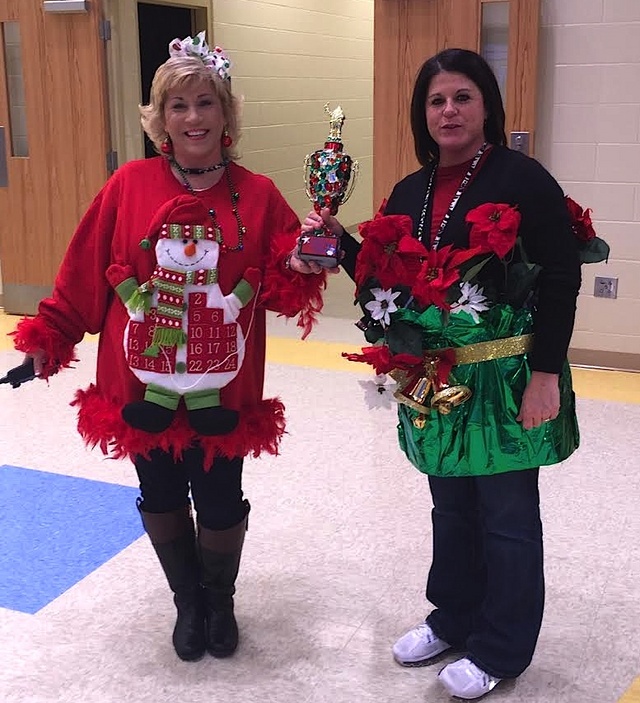 2014-12-10 - 158 Col. Casey Drive, Columbia, KY - Photo by Patty Jones, Principal. The staff at Adair County Primary Center, 158 Col. Casey Drive, Columbia, KY 42728, celebrated Christmas with a catered meal, rousing game of Dirty Santa, and the crowning of this years Queen of the Ugly Sweater. Pictured is this year's winner, Dana Harmon, Camp Casey Coordinator at ACPC, being presented the coveted bejeweled trophy from the reigning queen (and this year's first runner-up), Julie Cowan. Congratulations to the winner and thanks to all of the worthy candidates who paraded in an early morning "fashion show" for our students. From all of us at ACPC to everyone...Merry Christmas!! Patty R. Jones, Principal