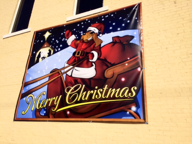 2014-12-11 - North Columbia Avenue, Campbellsville, KY - Photo by Larry Smih. A Big Dawg Santa waves from his sleigh to passers by on N. Columbia Avenue, Campbellsville, KY, on the side of the studio, 101 E Main Street, Campbellsville, KY. - Larry Smith, Operations Manager, Shoreline Communications