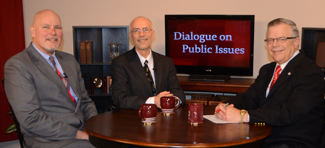 2014-12-11 - WLCU Broadcast Studios, 203 West Broadway, Campbellsville, KY 42718U - Photo by Rachel DeCoursey, Campbellsville University. Campbellsville University's Dr. John Chowning, vice president for church and external relations and executive assistant to the president of CU, right, interviews from left: Dr. Scott Wigginton, professor of pastoral ministries and counseling; and Dr. John Hurtgen, dean of the School of Theology, for his "Dialogue on Public Issues" show. The show will air Monday, December 15 at 1:30pmET and 6:30pmET and Wednesday, December 17 at 1:30 pmET and 7pmET on WLCU-TV, on Campbellsville's cable channel 10 and at 8 amET and at 6:30 pmET Sunday, December 14 on both WLCU-TV and on 88.7 The Tiger radio. - Joan C Mckinney, CU