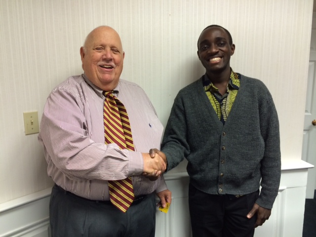 2014-12-09 - Cranmer Dining Center, 430 Helen Flatt Drive, Columbia, kY - Photo by Ellen Zornes. Derrick Kisita, right, is the newest member of the Columbia Rotary Club and makes our local club a truly international club. Derrick is from Uganda, Africa and a student at Lindsey Wilson College majoring in Christian Ministries. He is very involved in the Uganda Counseling and Support Services (UCSS) whose mission is to improve the quality of life and spread God’s love to people in remote communities of Uganda by providing social services, counseling and spiritual development - one community at a time. UCSS is using a holistic approach that addresses clean water, medical care, education, economic development, counseling and spiritual development. Greeting him is Rotary Club President Hunter Durham. - Ellen Zornes Paired photo, see also: Hannah Hayduk, Rotary Exchange student, speaks to Rotary