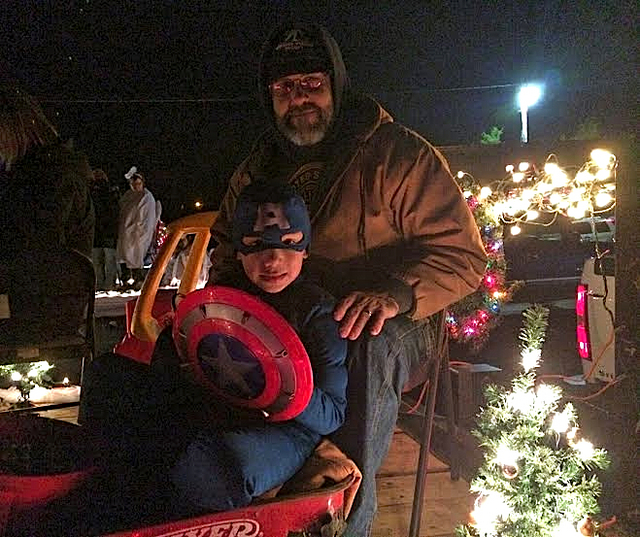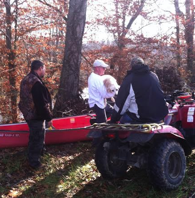 2014-12-07 - Pelham Branch Road, Columbia, KY - Photo by Lisa Sopha. Pelham Branch Road neighbors from several families were involved in the rescue of Mark Willis dog, above back on high ground. Besides Mark there were Fuzzy, neighbor Roger and others. The operation included letting Mark Willis down the cliff in a canoe, by rope, a float down Russell Creek, and then picking dog, canoe, and Mark up at a take out point near the bridge.