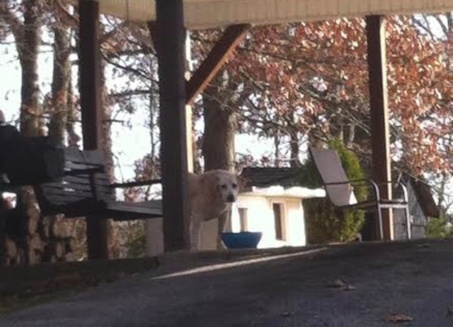 2014-12-07 - Pelham Branch Road, Columbia, KY - Photo by Lisa Sopha. Mark Willis' dog above, after a half day ordeal marooned at the bottom of a 25 ft. Russell Creek Cliff from 2am Sunday morning to Sunday afternoon.. He was rescued by Mark Willis and some great neighbors in a dramatic rescue operation. The dog is back home, safe, well fed, but sore, above.