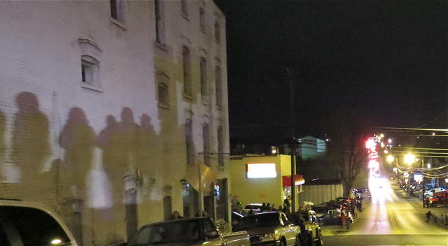 In a way, it was multimedia street theater. The Christmas in Columbia parade, with sirens screaming, had most he attention of the crowd, but across the street, on the "Lerman's" - Russell Buiilding Wall - a silent movie was playing, continuously changing with the shadows on the wall, created by the fortuitous backlighting of the waiting spectators backlit by a Columbia Police Department prowler. It was a reminder of early outdoor cinema, when walls served a screens, a bit like the scene, in Cinema Paradisio, when the projectionist, Alfredo, turns the projector to a building in the town Square for all the townspeople to see the picture show. Paired Photo: See also: Waiting watchers, unknowingly performers in theater at time