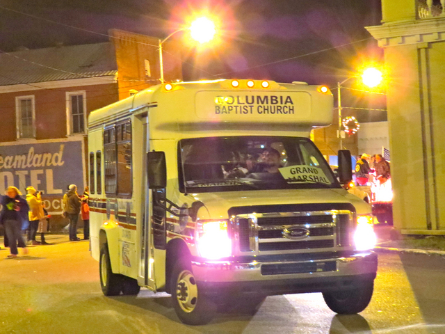 2014-12-07 - 500 Public Square, Columbia, KY - Photo by Linda Waggener, CM . For so many, this was a moment of a lifetime, the moment of the parade, when the Baptist Church bus stopped in front of the historic Adair County Courthouse. Aboard were men from among our most treasured citizens, Adair County's veterans from World War II: Elbert Burton () Burton, Brooks Coomer, George Keltner, () Burris, Bro. Raymond Martin, Bob White, and Edgar Holmes. Joe Hare, VFW Post 6097, Commander, sums up his feelings about the day, "Every veteran, along with the general public were very pleased that the WWII veterans were the grand marshals. Their numbers are becoming very few and they deserve all the honors we can bestow upon them - they are the heros for all younger veterans." - LW