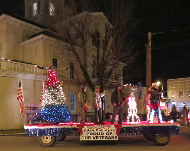 2014-12-07 - 500 Public Square, Columbia, KY - Photo by Linda Waggener, CM . This float carried the sign, Adair County is Proud of Our Veterans, and the message struck a cord with all in the crowd. On the float are Larry Rooks, Gary Cox, (Need first name) Conover, David Hale, and Jon Hale.