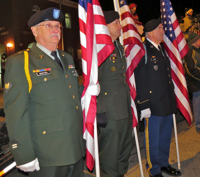 2014-12-07 - 424 Public Square, Columbia, KY - Photo by Linda Waggener, CM . With the flags are VFW Post 6097 members, from left, Ron Burton, Ronnie Holt, and Commander Joe Hare, at attention as the Grand Marshal Veterans were honored. - LW