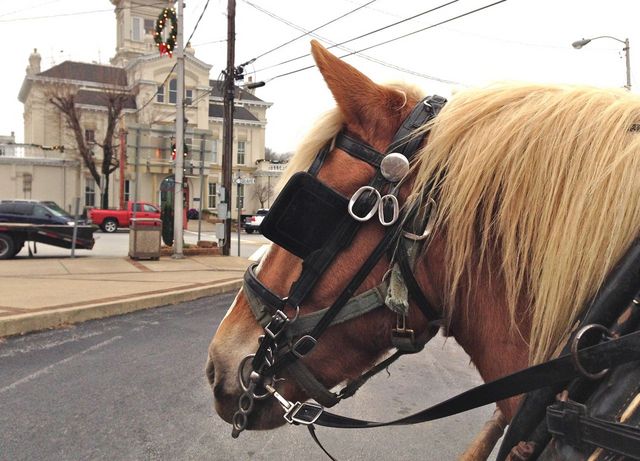 2014-12-07 - Adair Annex, 424 Public Square, Columbia, KY - Photo by Linda Waggener, CM . After the Christmas in Columbia booths in the old courthouse closed Saturday, the horses rolled in for free carriage rides which would go on until time for the parade. The horses are miniature Belgian Haflingers with thick coats of hair to help them fight the cold.