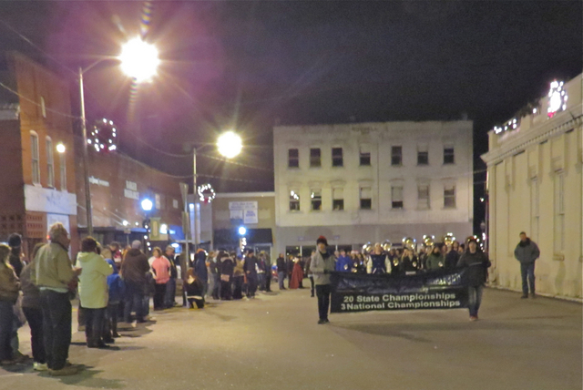 2014-12-07 - Public Square, Columbia, KY - Photo by Linda Waggener, CM . The banner isn't boasting. Just the facts. 20 State Championships. Three national championships just this year. There's always a feeling that the annual Christmas in Columbia Parade is a reality when the band is first heard at the top of Jamestown Hill, with quickening emotions as the volume increases as they come through The Dip, up Town Hill, onto the Public Square. Wow - they'll never talk about it - but this band has been truly inspirational, overcoming adversity which could have stopped some programs at the outset. But not this ADAIR Band. Not this latest in a continuing Tradition of Excellence which sets a high bar for other endeavors in the county. - EW