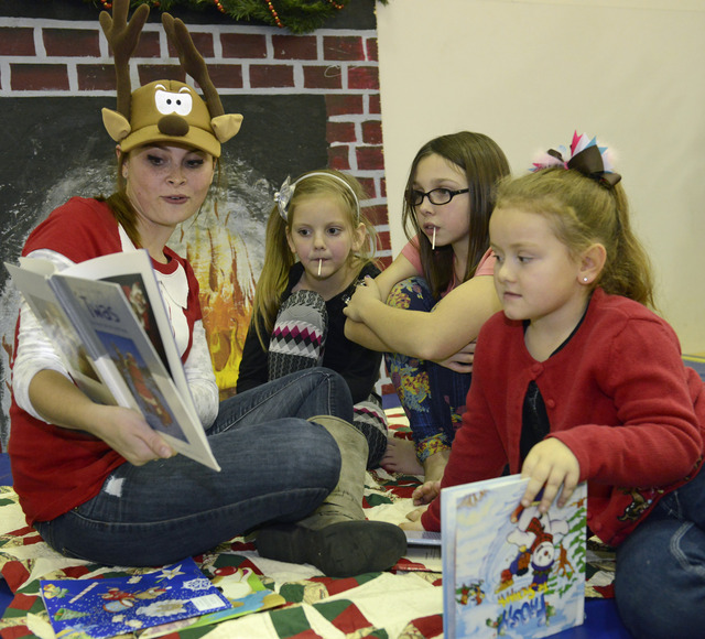 Lindsey Wilson College education major Josie Lyon of Lebanon, Ky., reads The Night Before Christmas to, from left, Kylie Spires, 7, of Columbia, Eliza Spinks, 10, of Columbia and Riley Price, 5, of Liberty. The three girls were among more than 650 area residents who attended Saturday's fourth-annual Lindsey Wilson Christmas Carnival, held in the Doris and Bob Holloway Health & Wellness Center.