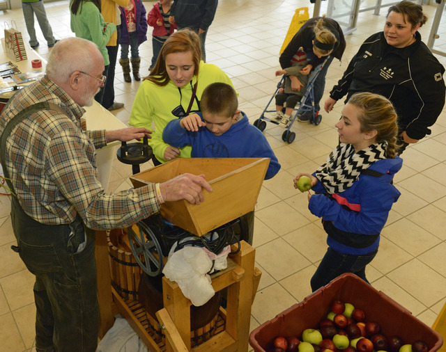 Jerry Holt of Columbia gives a lesson in pressing juice from apples to Tyler Anne Corbin, 16, of Greensburg, Ky., Gage Corbin, 9, of Greensburg, Ky., and Reilly Wells, 11, of Columbia, Saturday during the fourth-annual Lindsey Wilson Christmas Carnival, held in the Doris and Bob Holloway Health & Wellness Center.