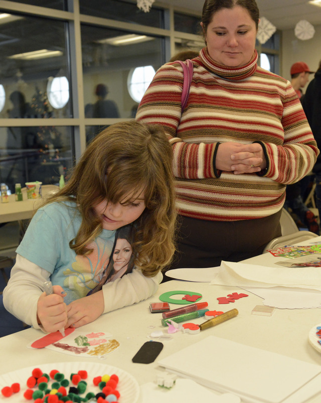 Katie Kean, 5, of Columbia creates a mitten ornament while her mother, Kimberly, looks on Saturday during the fourth-annual Lindsey Wilson Christmas Carnival