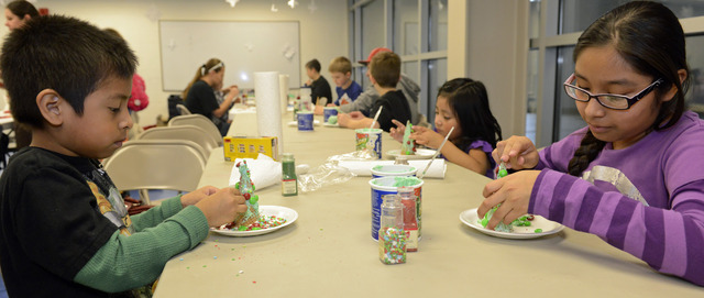 Johnny Hernandez, 7, and his sister, Jazmine, 11, both of Columbia, make Christmas trees out of ice cream cones, icing and M&M candies Saturday during the fourth-annual Lindsey Wilson Christmas Carnival.