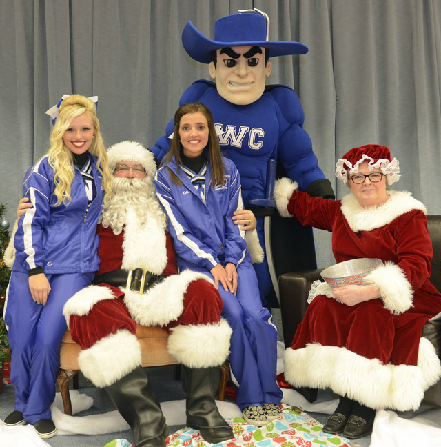 Santa and Mrs. Claus hear the Christmas lists of LWC cheerleaders Amiee Young of Edmonton, Ky., Katie Stone of Columbia and Blue Raider Bob Saturday during the fourth-annual Lindsey Wilson Christmas Carnival
